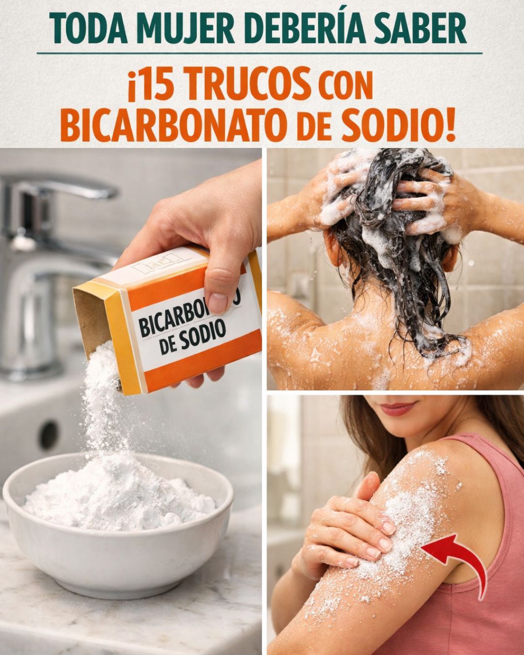 1. Refresco del cuero cabelludo entre lavados Si sientes el cabello pesado o graso, una pizca de bicarbonato mezclada con tu champú ayuda a eliminar residuos de productos. Úsalo ocasionalmente para mantener el equilibrio.