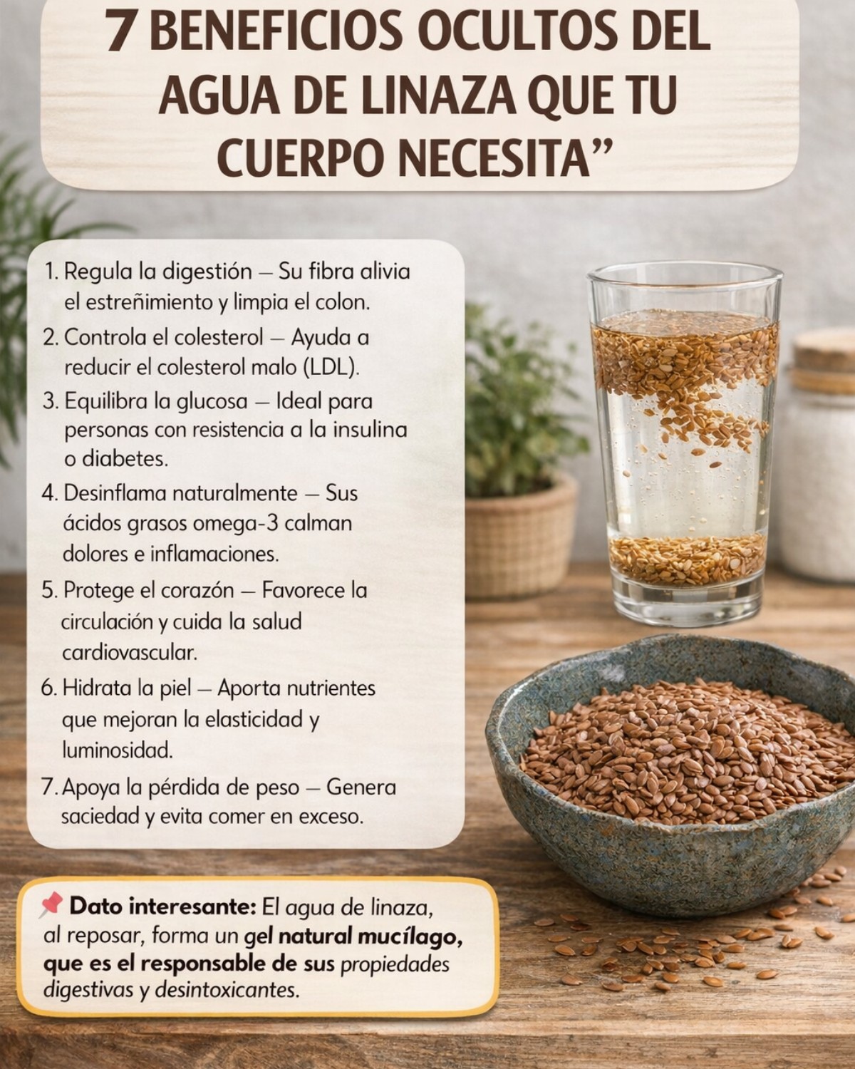 La linaza es pequeña, pero poderosa. Cuando se deja en agua, libera compuestos que muchas personas pasan por alto. Como te explica tu guía natural, el agua de linaza no es una moda nueva: se ha usado tradicionalmente para cuidar la digestión y el metabolismo.