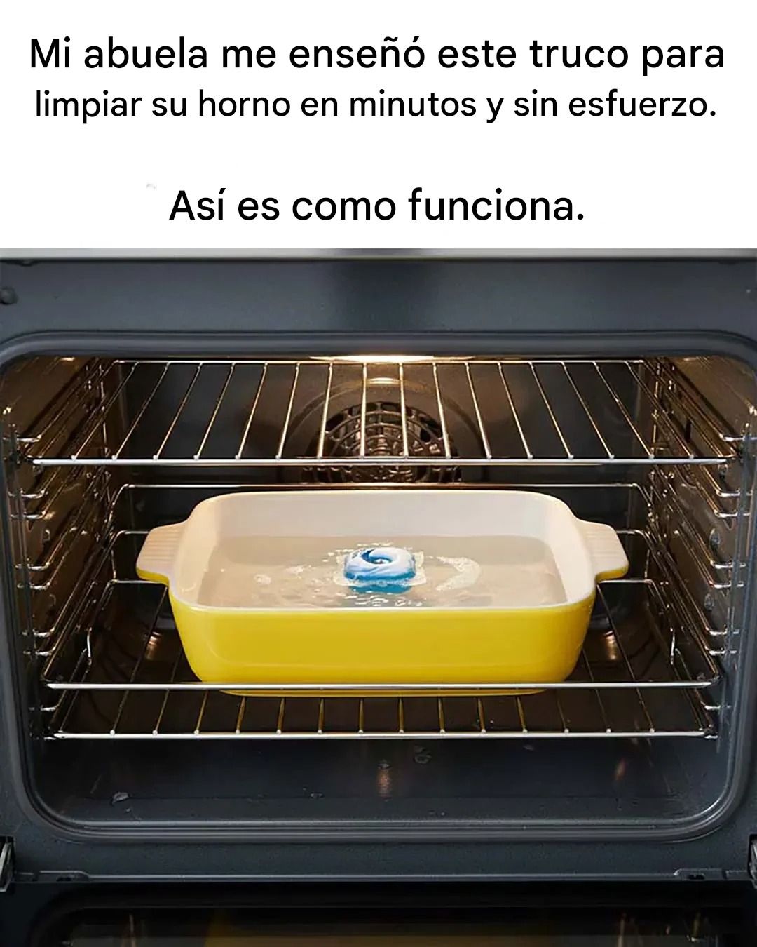 Es un secreto de abuela que cabe dentro… ¡una cápsula para lavavajillas! Sí, la que se mete en el compartimento de los platos sucios. ¿Por qué funciona? Porque estas pequeñas cápsulas contienen potentes agentes desengrasantes diseñados para eliminar hasta los residuos más difíciles. Y, al combinarse con el vapor, todo el interior del horno se suaviza suavemente. ¡Increíble, ¿verdad?!