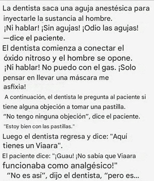 Genial. ¿Y qué hay del gas? Podemos usar óxido nitroso. Seguro. Sencillo. Te ayuda a relajarte.