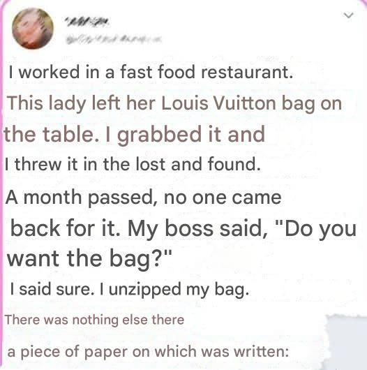 Una vez, mientras trabajaba en un restaurante de comida rápida, descubrí un bolso Louis Vuitton de mujer sobre la mesa. Después de esperar veinte minutos, decidí llevarlo a objetos perdidos porque sabía que no volvería. Simplemente lo dejé y volví al trabajo sin mirar dentro.